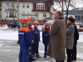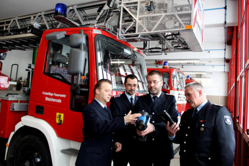 Am Freitag, dem 2. Oktober 2009, stattete der Chef der Staatskanzlei Thüringens, Dr. Klaus Zeh, der Stadt Bleicherode einen lang ersehnten Besuch ab. Er hatte einen Fördermittelbescheid des Landes Thüringen im Gepäck. Das Feuerwehrgerätehaus in der Gütersloher Straße war der richtige Rahmen für die Übergabe des Bescheides an Bürgermeister Frank Rostek. Auch der 1. Beigeordnete, Dr. Uwe Landsiedel, und Ordnungsamtsleiter Burkhard Keil waren zugegen, als der Minister den Bescheid über 125.000 € aushändigte. Die Summe ist für die notwendige Beschaffung eines Hilfeleistungs-Löschgruppenfahrzeuges HLF 20/16 vorgesehen. Die Bleicheröder Feuerwehr mit ihrem großen Verantwortungsbereich kann auch bei Unfällen auf der Autobahn BAB 38 vom Höllbergtunnel im Eichsfeld bis nach Werther zum Einsatz kommen und benötigt dafür die entsprechende moderne Technik. Bürgermeister Rostek bedankte sich im Namen der Stadt und der Feuerwehr für die Unterstützung des Ministers. Auch die Stadt Bleicherode ist ständig bemüht, ihre Feuerwehr im Rahmen ihrer Möglichkeiten zu unterstützen. So ist z. B. die verstärkte Nachwuchsförderung nicht nur eine wichtige Aufgabe der Feuerwehr selbst, sondern auch ein Anliegen des Bleicheröder Stadtoberhauptes. Deshalb erhalten seit dem Jahr 2009 die jüngsten Mitglieder der Wehr Saisonkarten für das Bleicheröder Freibad. Durch die Herabsetzung des Eintrittsalters von Kindern in die Jugendfeuerwehr auf 6 Jahre hat das Interesse der kleinen Bleicheröder für die Feuerwehr stark zugenommen.