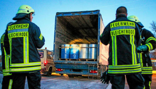 Am Freitag sorgte ein undichtes Fass in einem Gefahrgut-Transporter für einen Einsatz der Bleicheröder Feuerwehr. Gegen 16 Uhr fiel der Lkw eines deutschen Unternehmens bei einer Kontrolle auf der A38 auf und wurde von der Polizei zum Parkplatz Galgenberg in Richtung Leipzig geleitet. Dort entdeckten die Kontrolleure ein undichtes Fass, aus dem eine Nickel-Verbindung austrat.