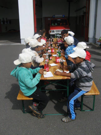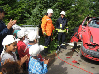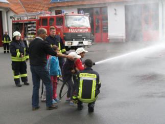 Besonders viel Spaß machte den Kindern das Zielspritzen. Stadtbrandmeister Burkhard Keil erklärte: „Wasser ist für diese Kinder ein kostbares Gut; mit ihm zu spielen, kennen sie nicht.“