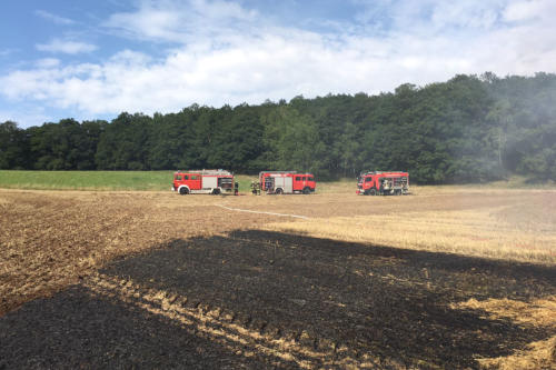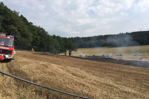 Brandursache und Maßnahmen: Der Brand, der über eine Fläche von sechs Hektar wütete, wurde durch eine Strohballenpresse ausgelöst, die während der Arbeit Feuer fing. Um 15:30 Uhr ging die Alarmierung bei der Feuerwehr ein. Die Einsatzkräfte setzten Feuerpatschen und Wasser ein, um die Flammen einzudämmen. Die Landwirte unterstützten die Feuerwehr, indem sie die Strohballen entfernten und eine Schneise zogen, um die Ausbreitung des Feuers zu verhindern.